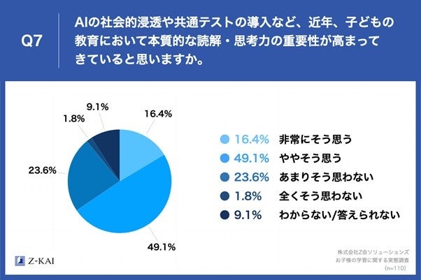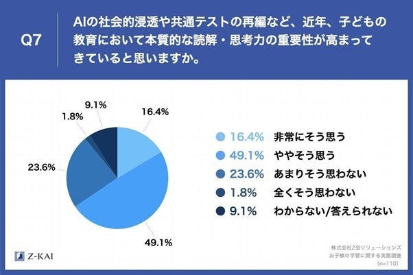 「Q7.AIの社会的浸透や共通テストの導入など、近年、子どもの教育において本質的な読解・思考力の重要性が高まってきていると思いますか。」(n=110)と質問したところ、「非常にそう思う」が16.4%、「ややそう思う」が49.1%という回答となりました。