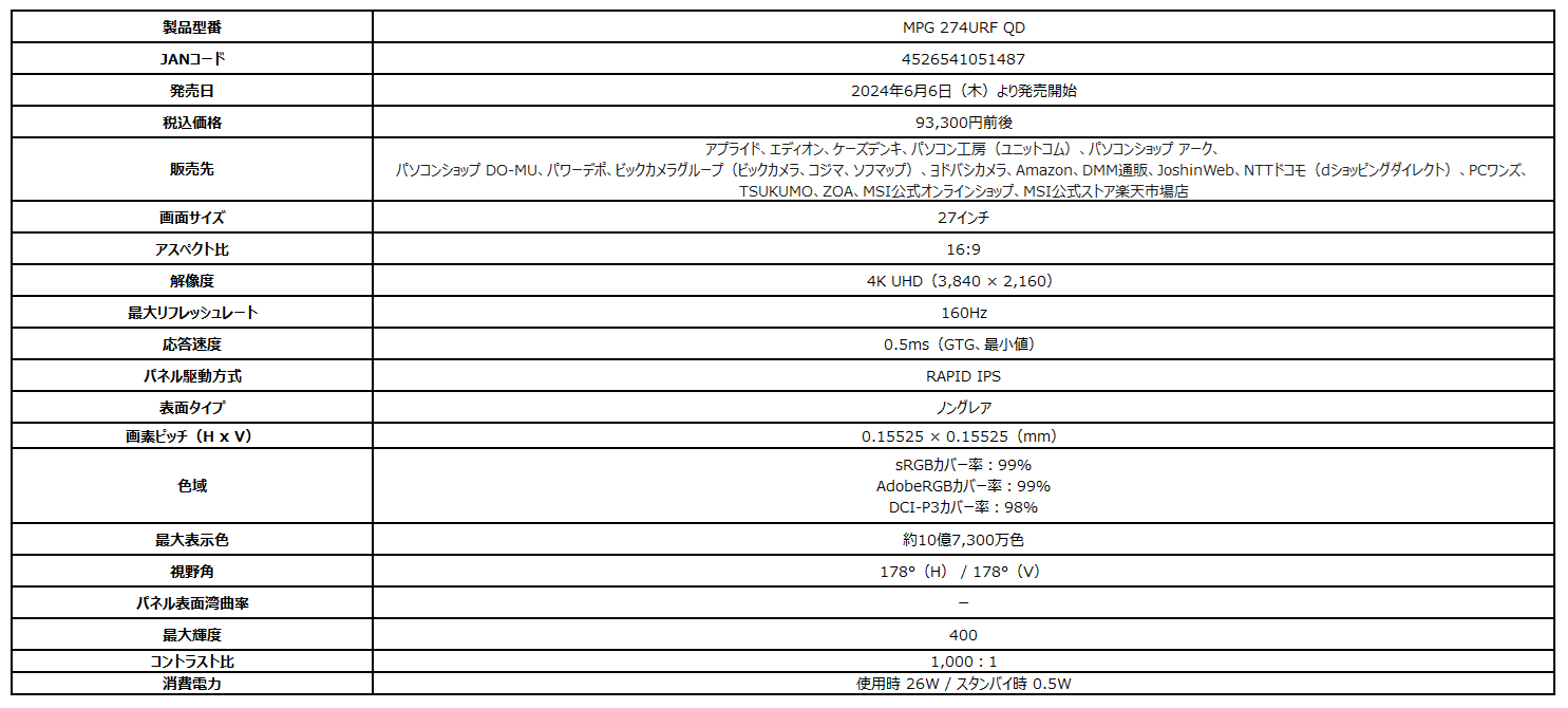 4K/量子ドット/RAPID IPSで高いゲーミング性能と高画質を両立27インチ・160Hz・0.5ms(GTG)・USB PD65Wのハイスペックモデル「MPG 274URF QD」発売