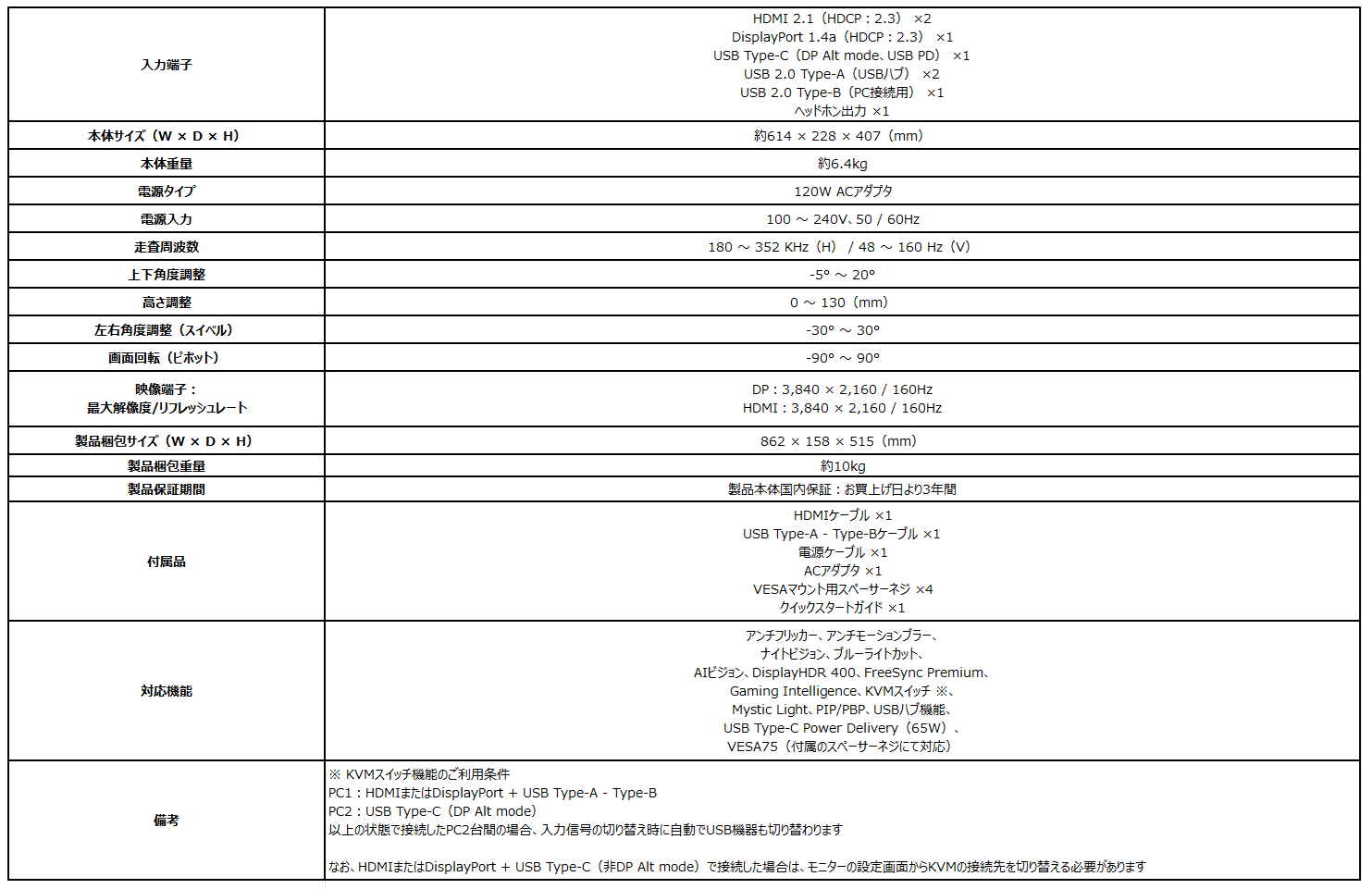 「MPG 274URF QD」は近年注目が高まっている4K UHD解像度、色純度の高い発色が特徴の量子ドット、高画質と高速応答を両立したRAPID IPSパネルで美しい映像とゲーミング性能を両立し、リフレッシュレート160Hz、応答速度0.5ms(GTG、最小値)の高いゲーミング性能と、黒挿入機能であるアンチモーションブラーにより競技性の高いゲームタイトルが快適にプレイできます。映像シーンに合わせて画面の明るさ・コントラスト・彩度を自動で調整するAIビジョン、リアルな映像表現が可能なDisplayHDR 400、Freesync Premiumに対応し、ストレスフリーでゲームプレイを楽しむことができます。さらにUSB PD65WやKVMスイッチ、高性能スタンド、PC上からモニターの各種設定・プリセット登録が可能なGaming Intelligenceを搭載し、プロ向けの色域にも対応でクリエイターにもお勧めです。また、モニターアームなどに取り付け可能なVESA規格にも対応しています。
