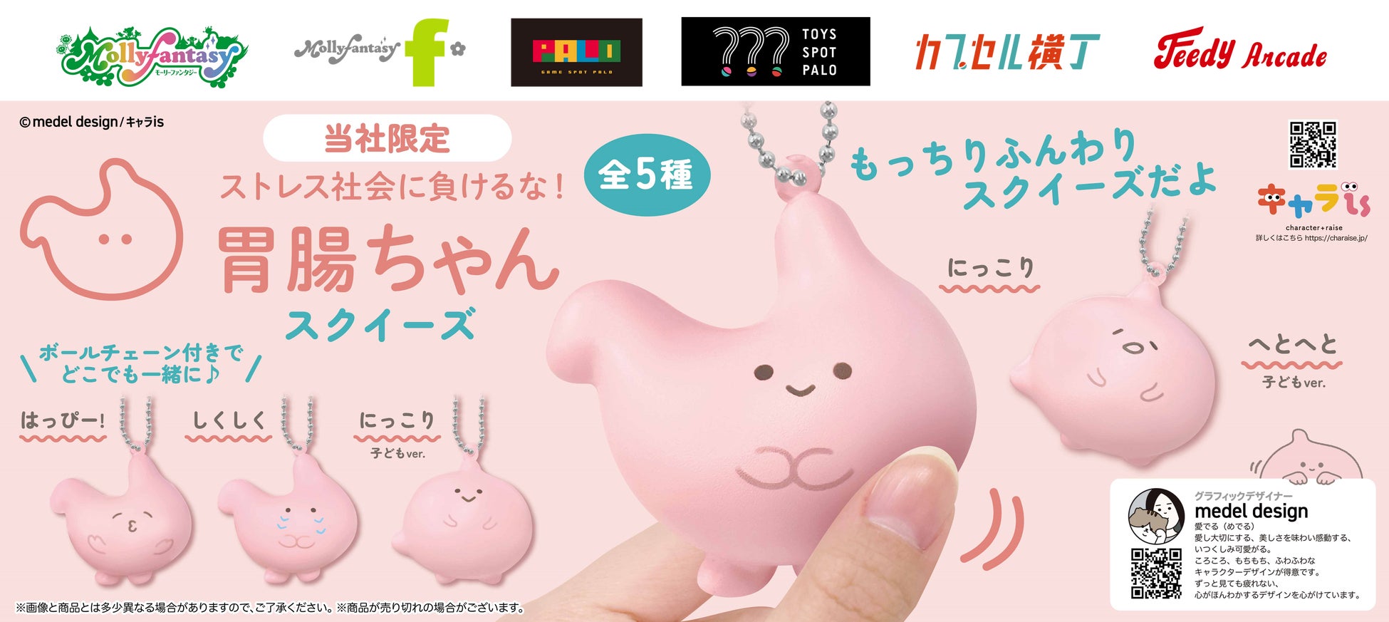 株式会社イオンファンタジー(本社:千葉県千葉市、代表取締役社長:藤原徳也、以下、当社)は、当社が運営するオリジナルキャラクター特化型プラットフォーム「キャラ is」(URL: https://charaise.jp/)から生まれたキャラクター「ストレス社会に負けるな!胃腸ちゃん」のカプセルトイ用商品「ストレス社会に負けるな!胃腸ちゃんスクイーズ」を、アミューズメント施設「モーリーファンタジー」「PALO」、カプセルトイ専門店「TOYS SPOT PALO」「カプセル横丁」などに設置する当社オリジナル完全キャッシュレスカプセルトイマシン「かぷえぼ」にて6月18日(水)より順次展開いたします。