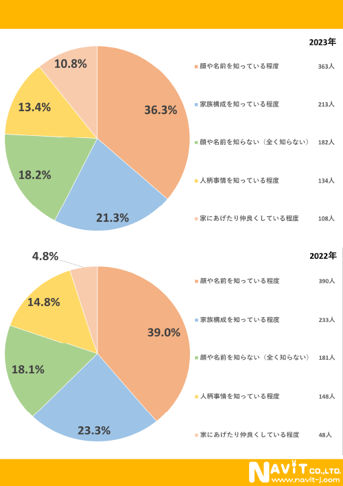 今回のアンケートではコロナ禍と、その後での内容の変化の大きさに驚きました。 普段は煩わしく感じるご近所付き合いですが、社会が大きく変わると人との付き合い方も大きく変わってくるのでしょう。