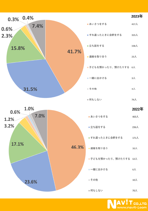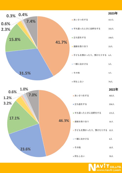 私たちは、互いに繋がり、支え合いながら、より良い地域を築いていくことができます。ご近所付き合いは、この1年でどのように変化したのでしょうか。昨年のアンケートの結果と比較しながら見ていきましょう。