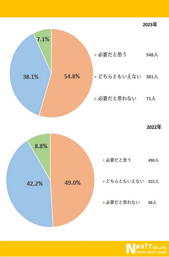 「必要だと思う」が54.8%で昨年の49.0%より5.8%増えています。「どちらともいえない」は38.1%で昨年の42.2より4.1%下がっています。ご近所付き合いが「必要だと思わない」も7.1%と昨年8.8%より1.7%下がっていますね。
