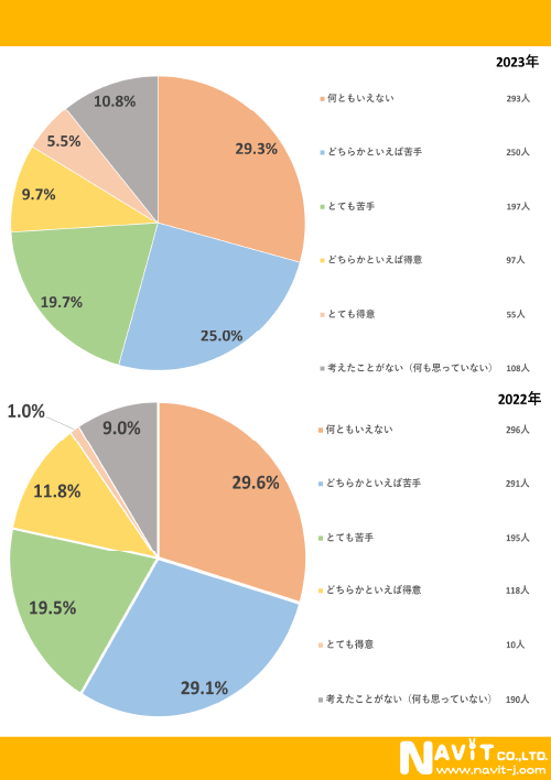 「何ともいえない」が29.3%と一番多く昨年(29.6%)とほぼ変わっていません。続いて「どちらかといえば苦手」が25.0%です。これは昨年(29.1%)から4.1%ダウンしています。「とても苦手」は19.7%で昨年(19.5%)の結果とほぼ変化なしです。このアンケートも「とても得意」という方が1.0%→5.5%と増えているのが印象的です。