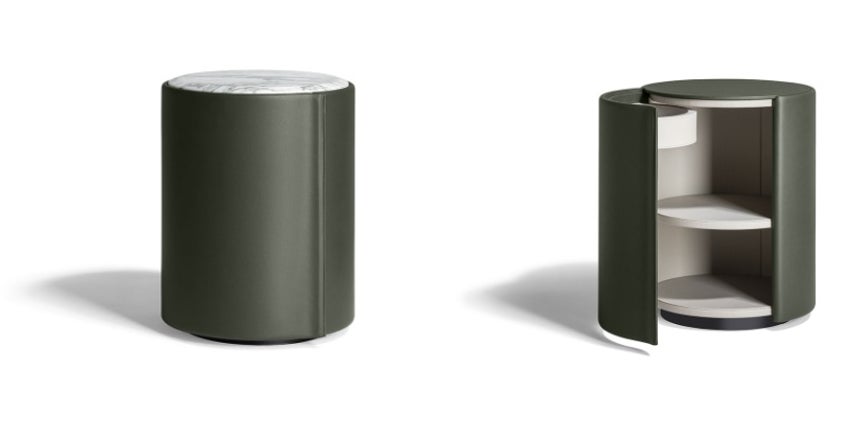 エレガントなカーブを描く扉と、異素材の組み合わせが生み出すコントラストが、空間に洗練された個性を添えます。本体の側面にはPelle Frau®レザーを、天板には光沢を抑えた上質な大理石または同レザーを採用しており、空間の雰囲気や好みに応じて選択いただけます。円筒のフォルムに、わずかにずらしたカバーの縁が取手のような役割を果たし、思わず手を伸ばしたくなるデザインです。軽やかな動作で開閉できる扉の内側には、小さなトレイと実用性の高い収納スペースが隠されています。