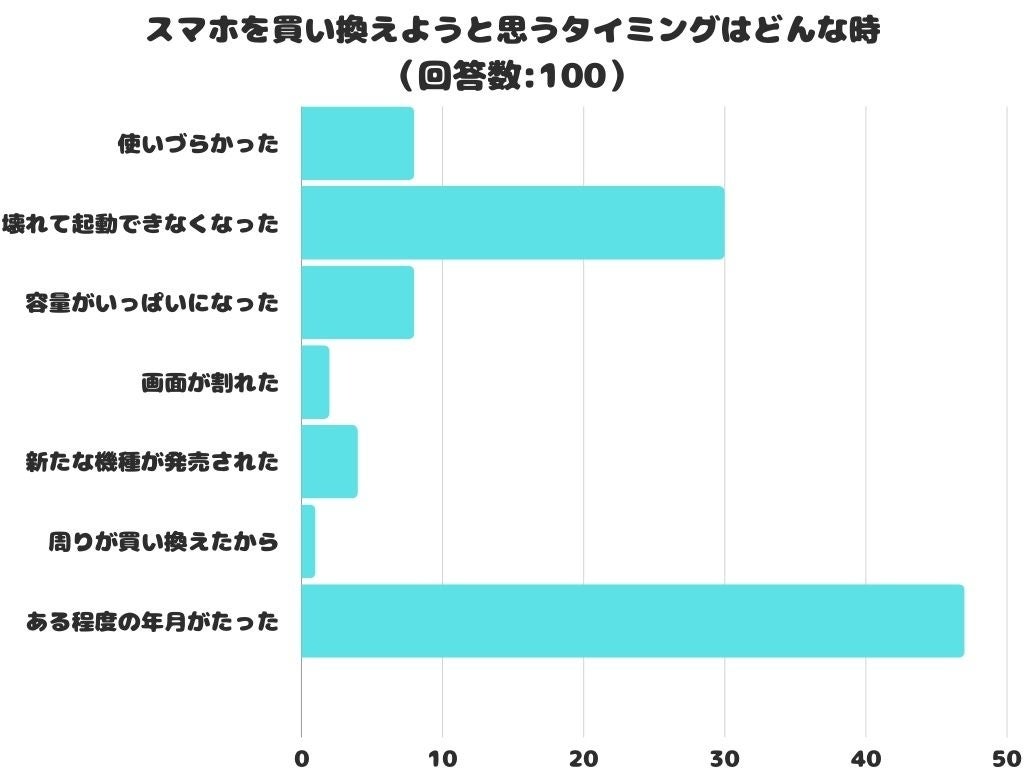 スマホを買い換えようと思うタイミングはどんな時をアンケートにて調査したところ、1位は「ある程度の年月がたった」でした。