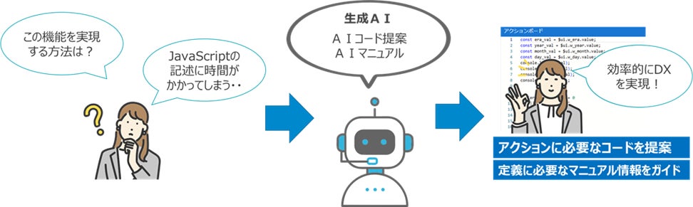 業務ロジックの拡張や外部サービスとの連携については、汎用言語であるJavaScriptの記述により、固有の強みを発揮できるシステムの実現が可能となります。今回のAIコード提案機能では、開発者が日本語でアプリケーションを動作させるための指示を記述すると、生成AIが要求内容のコードに加え、画面に設定された情報を考慮したコードを提案します。これにより、開発生産性が向上し、アプリケーション開発を効率よく進めることが可能になります。