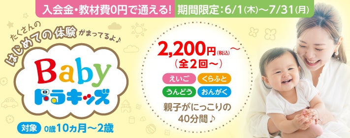 株式会社小学館集英社プロダクション(本社:東京都千代田区、代表取締役社長:都築 伸一郎、以下:ShoPro)が運営する満1歳から小学3年生までを対象にした、楽しく学べる小学館の幼児教室『ドラキッズ』では、0歳10カ月~2歳までの親子を対象にしたおためし特別レッスン「Baby ドラキッズ」を期間限定で開催します。