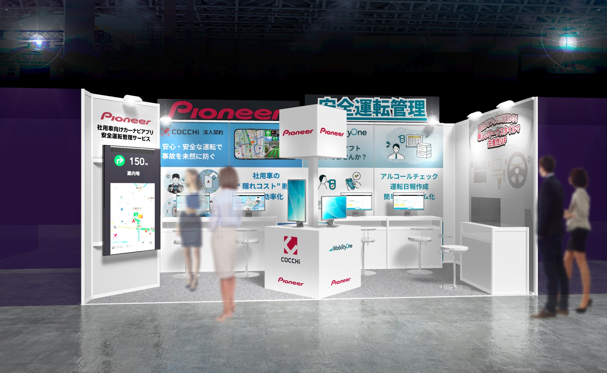 パイオニアブースでは、車を利用する業務を効率化できる法人向けカーナビアプリ「COCCHi(コッチ) 法人契約」と、アルコールチェックや運転日報などの安全運転管理業務を一元管理できるフリートマネジメントシステム「MobilityOne(モビリティ・ワン) 安全運転管理」を展示。業務のDX化をサポートする両サービスを、デモンストレーションを交えて紹介します。