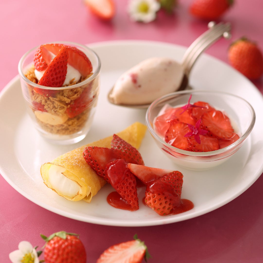 白ワインとフランボワーズのジュレやザクザク食感のクランブルに上品な甘さのいちご餡クリームを絞った「苺のモンブランパフェ」、サクサクのタルトに “やよいひめ” となめらかな口どけのクリームをのせた「苺のタルト」、こだわり卵で作る「苺のプリン・ア・ラ・モード」などのスイーツ10種のほか、ワインにもあうセイボリーがお目見えします。