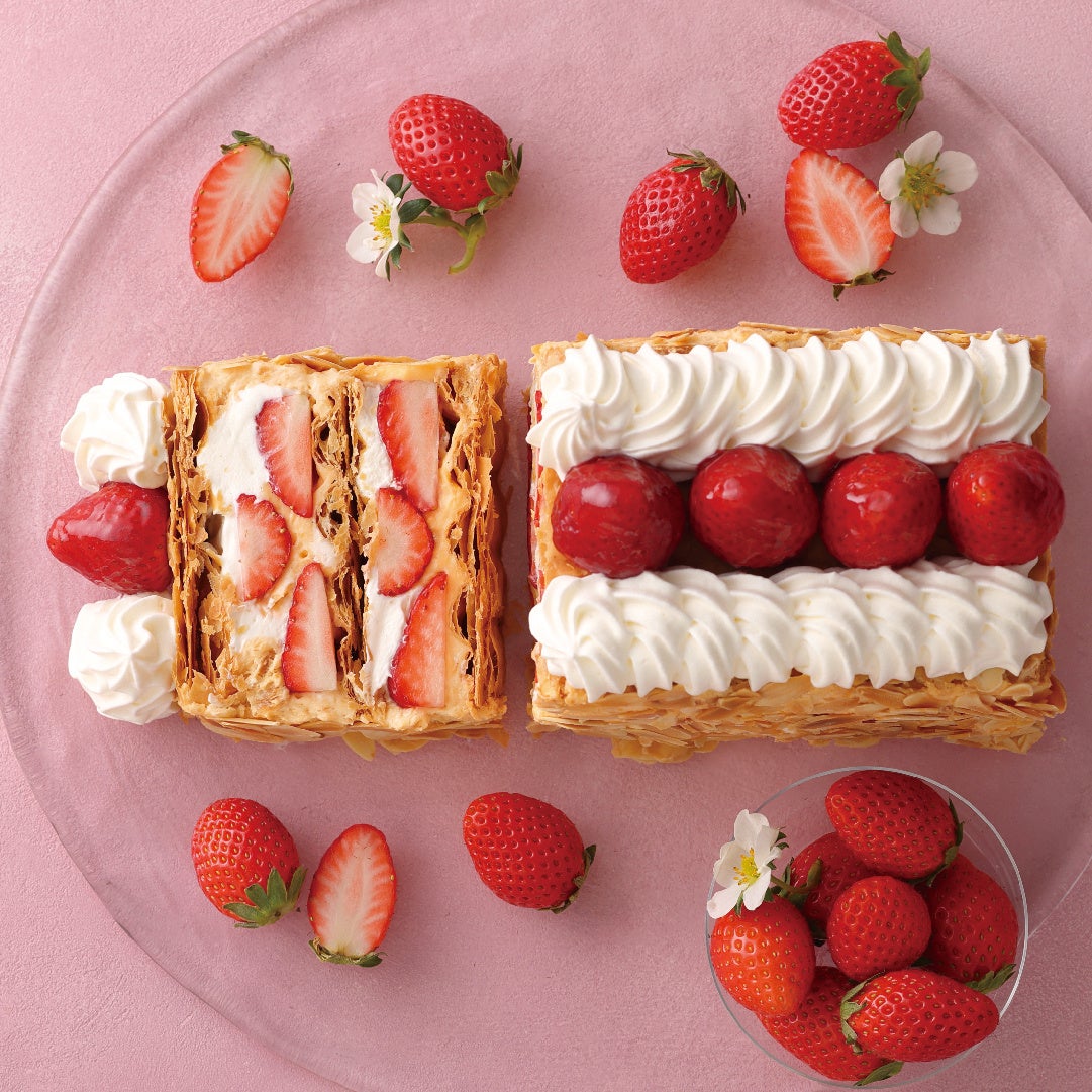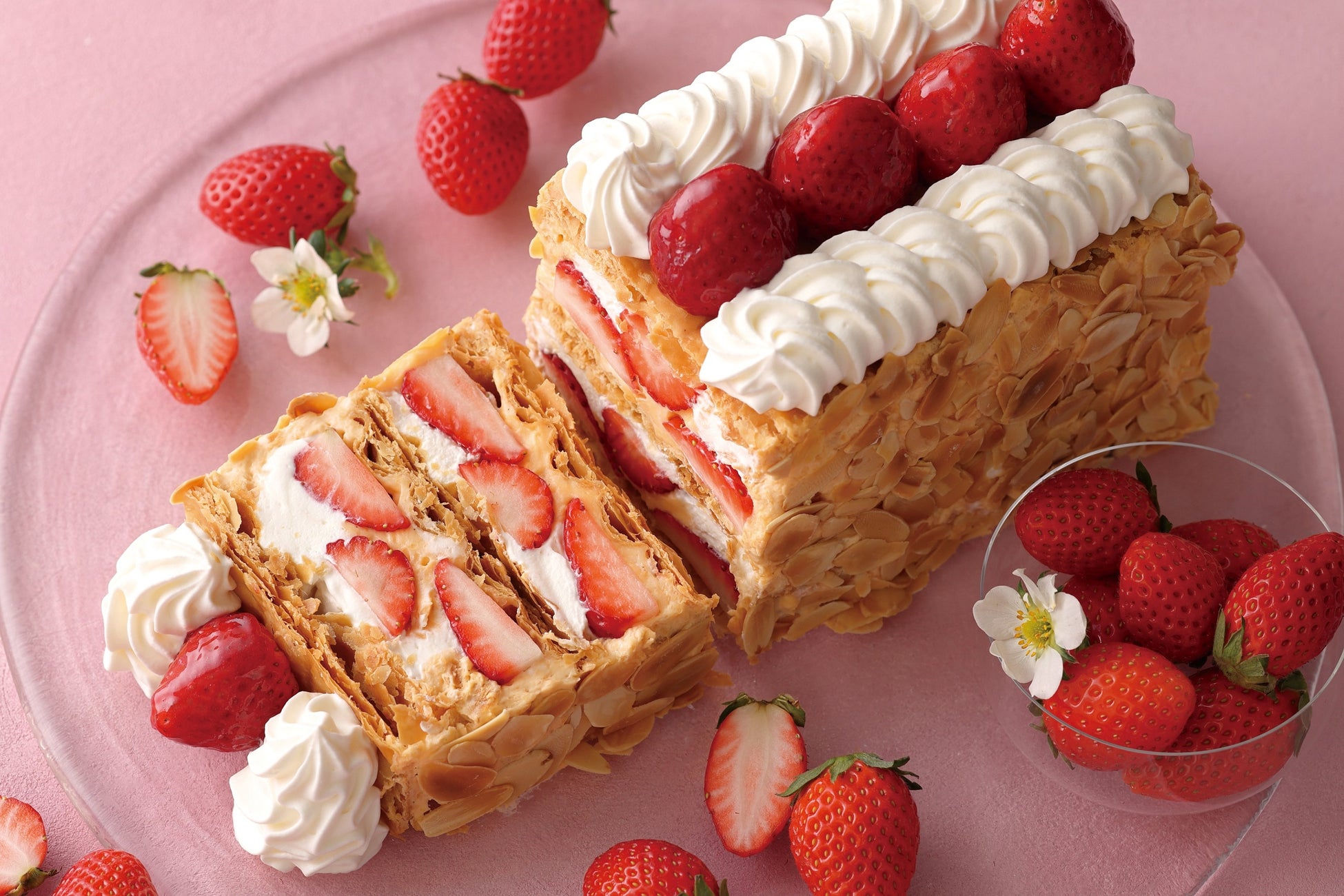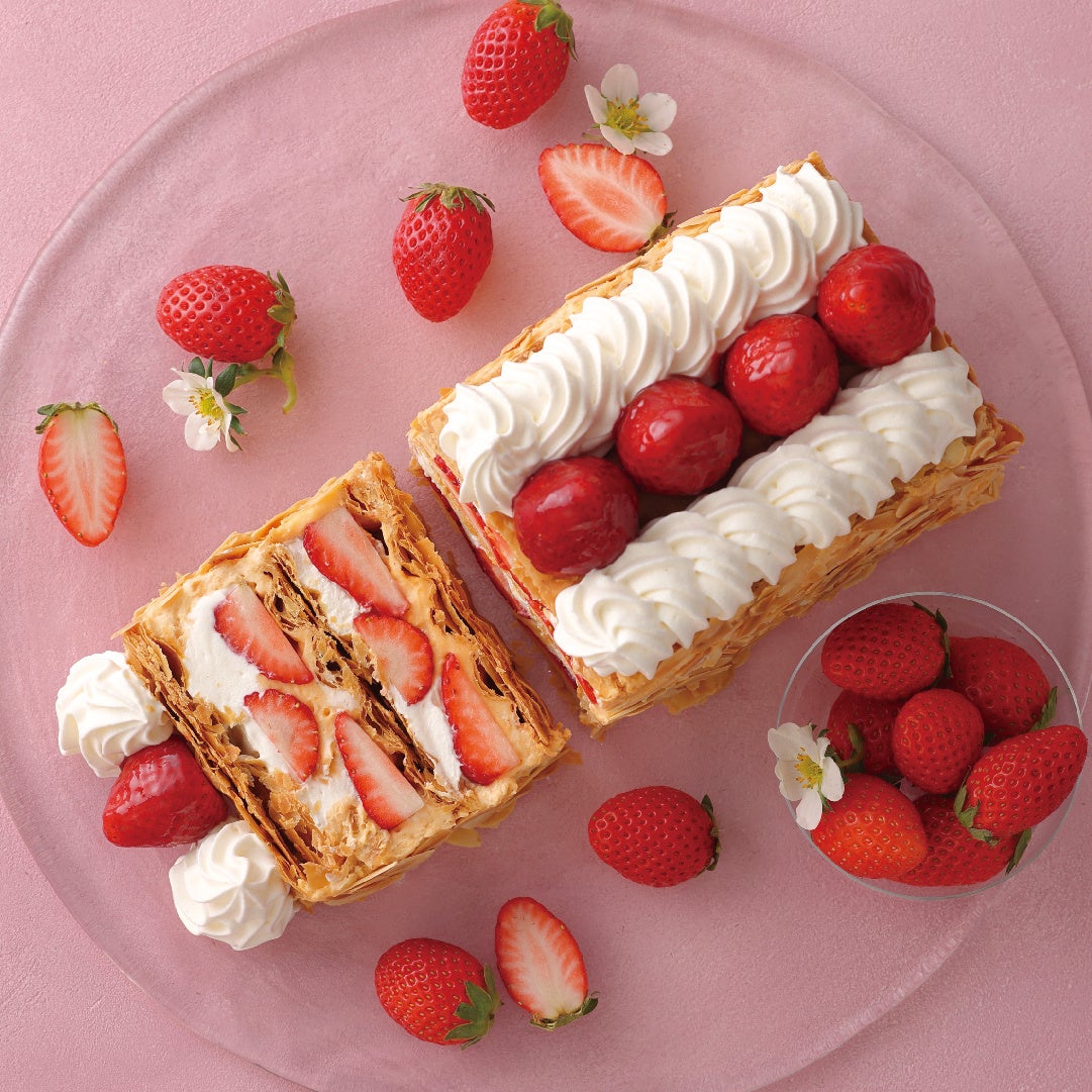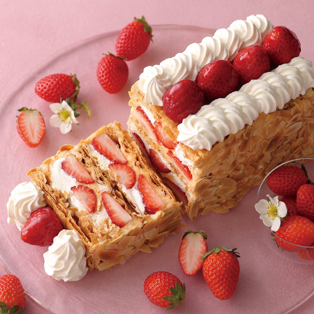 サクサクのパイ生地で、苺とクレーム・シャンティ、ディプロマットクリームを重ね合わせることで生まれる酸味と甘み、パイ生地の食感による絶妙なバランスが特徴です。