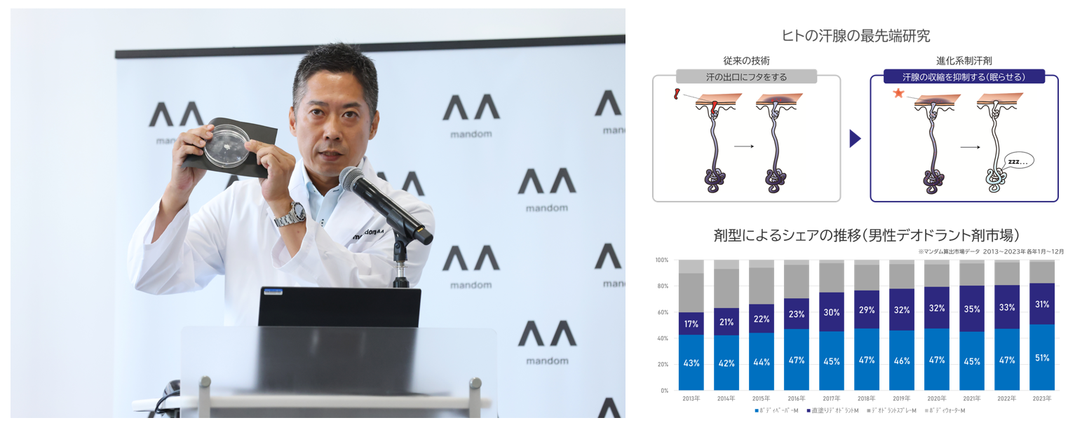 今回、イベントではマンダム 先端技術研究所 ライフサイエンス研究グループ マネジャー/臭気判定士 原 武史(はら たけし)より、研究成果である新たな制汗成分グリチルリチン酸モノアンモニウム(GMA)の説明に加え、制汗技術の歴史や、剤形別デオドラント剤の特徴・生活者ニーズについて解説しました。その中で、過去11年間の男性デオドラント市場における剤型のシェア推移では、近年、直塗りタイプのシェアが拡大しており、生活者において汗・においの悩みをよりしっかりと解決としたいというニーズが高まっていると述べました。また、今回の汗腺を「眠らせる」新技術も含め、「汗腺研究」を今後も継続し、生活者のさまざまな「汗とにおいの困りごと」に対応できるよう進化させていきたいと語りました。