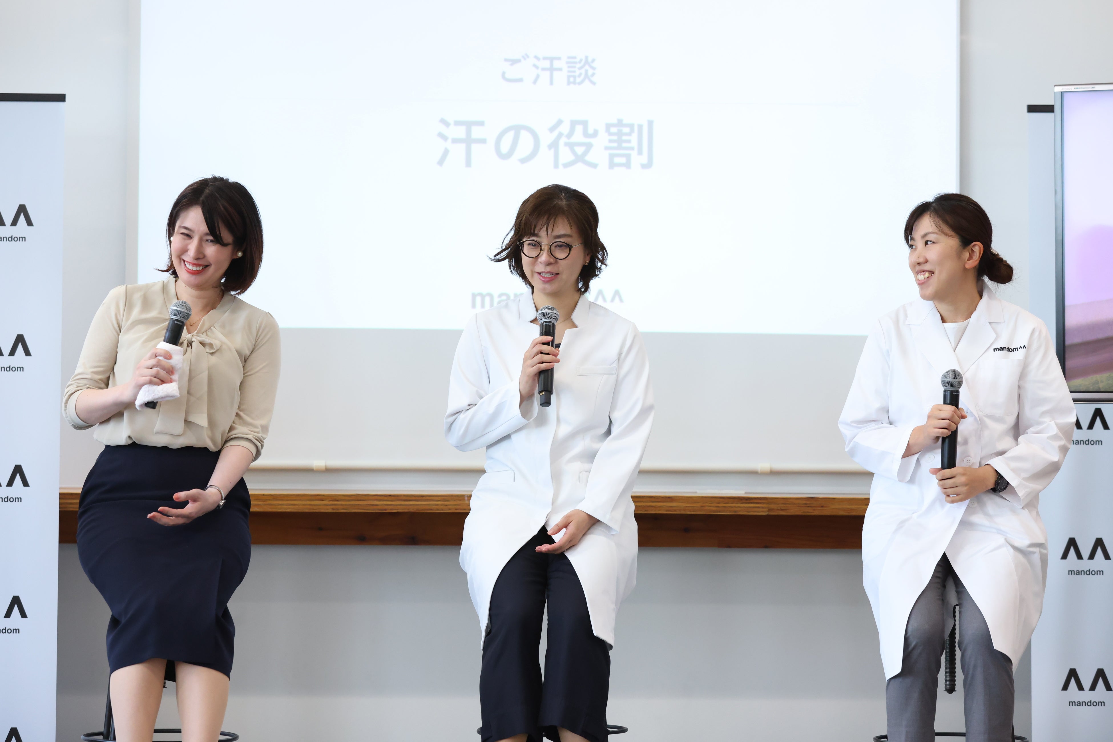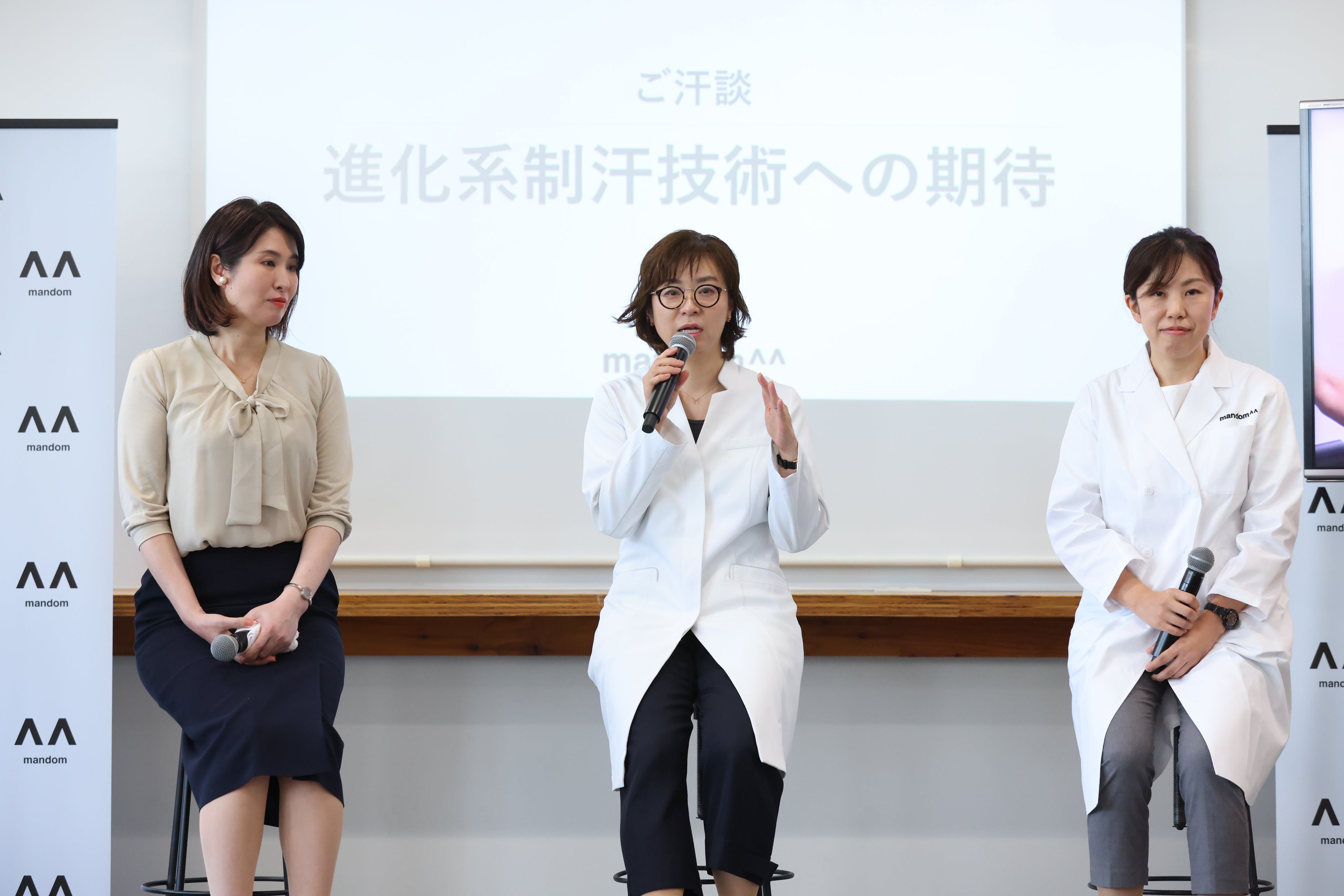 また、マンダム 先端技術研究所 ライフサイエンス研究グループ におい研究員/臭気判定士 久加 亜由美(きゅうか あゆみ)に加え、医療法人社団紬心会 池袋西口ふくろう皮膚科クリニック院長 藤本 智子(ふじもと ともこ)氏と、NPO法人 多汗症サポートグループ代表理事 黒澤 希(くろさわ のぞみ)氏を招き、「汗に関するお悩み」についてのトークセッションを行いました。