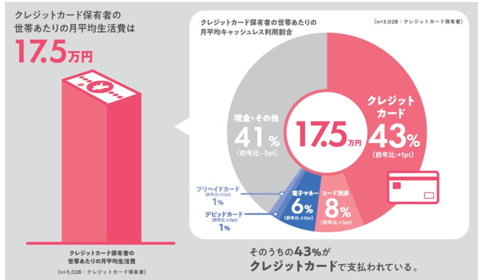 クレジットカード保有者の世帯あたりの月平均生活費は17.5 万円。そのうち43%の金額をクレジットカードで支払っており、利用割合が最も高い。(調査結果5 ページ参照)
