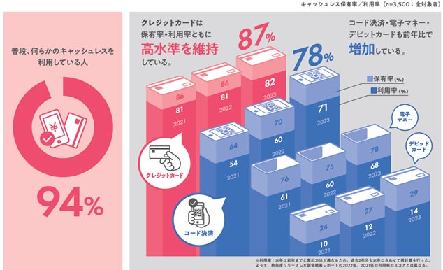 キャッシュレスを利用している人は94%、クレジットカードの保有率は87%と高水準を維持