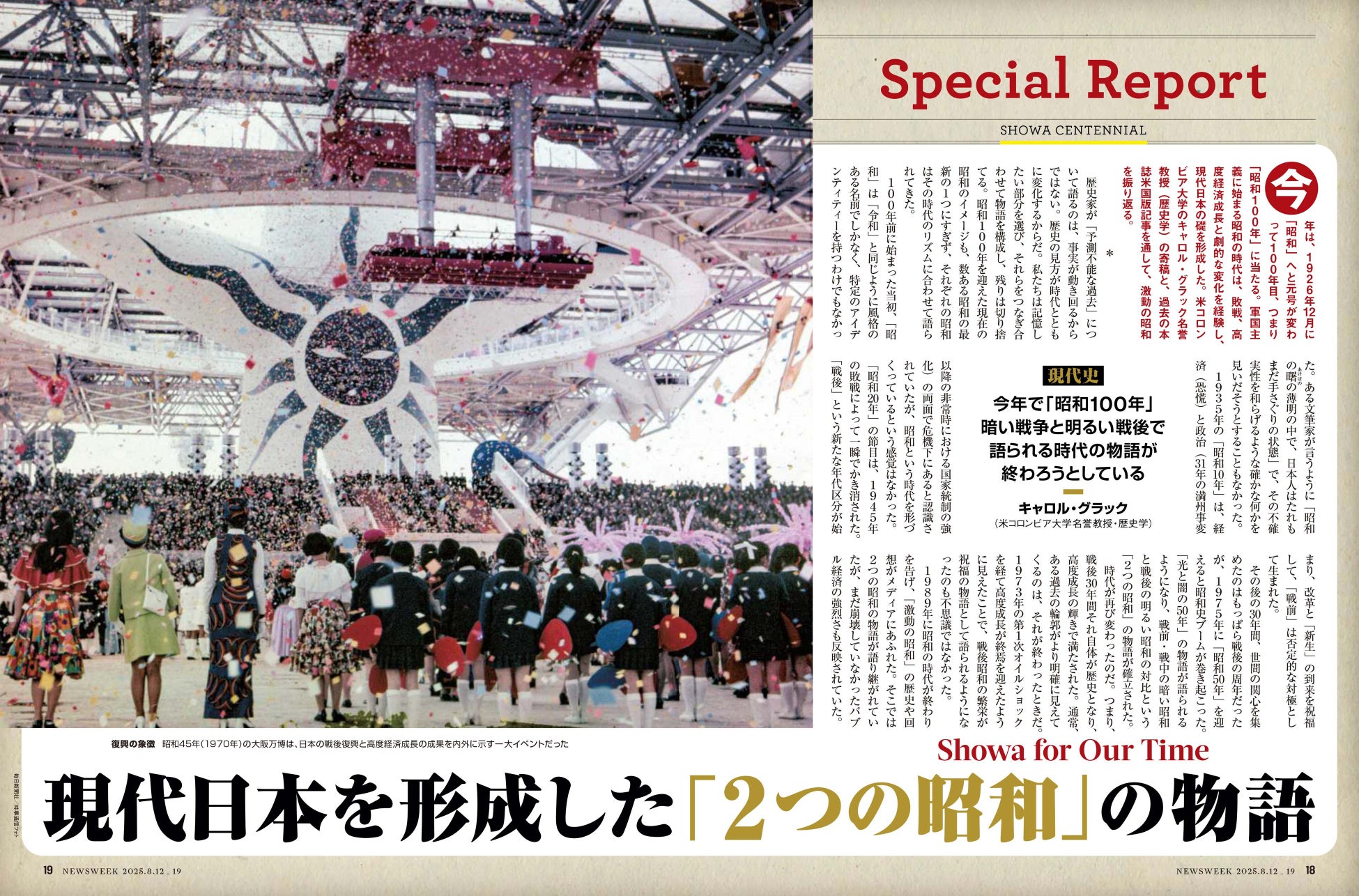 1926年に昭和が始まって今年で100年目。昭和がもし続いていれば、2025年が「昭和100年」です。昭和20年以前は戦争とその惨禍の時代、以降は復興と経済発展と平和の時代というストーリーが最も一般的ですが、日本人はそれ以外にもさまざまな「昭和の物語」を消費してきました。「歴史の見方は時代とともに変化する。私たちは記憶したい部分を選び、それらをつなぎ合わせて物語を構成し、残りは切り捨てる」。8月5日発売号の特集「昭和100年」で冒頭のコラムを寄稿した歴史学の泰斗・コロンビア大学のキャロル・グラック名誉教授の指摘です。100年の区切りの今、グラック教授の寄稿文と選りすぐりのニューズウィークの過去記事を通じて、昭和の見方がどう変化してきたか、そして昭和が今の日本でどう息づいているのかを知ってもらえればうれしいです。(長岡)
