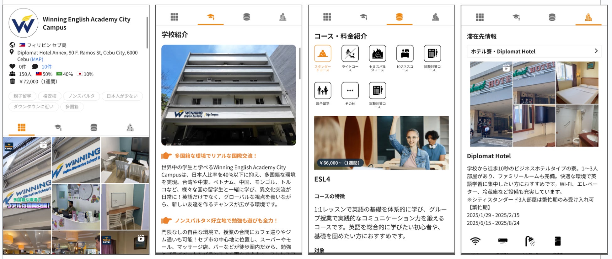 ネイティブキャンプ留学では、ユーザーが情報を分かりやすく把握できるよう、常に丁寧な情報提供を心がけています。Winning English Academyの詳細情報は、以下の4つのカテゴリーに分けて掲載しており、知りたい情報を的確にお届けします。