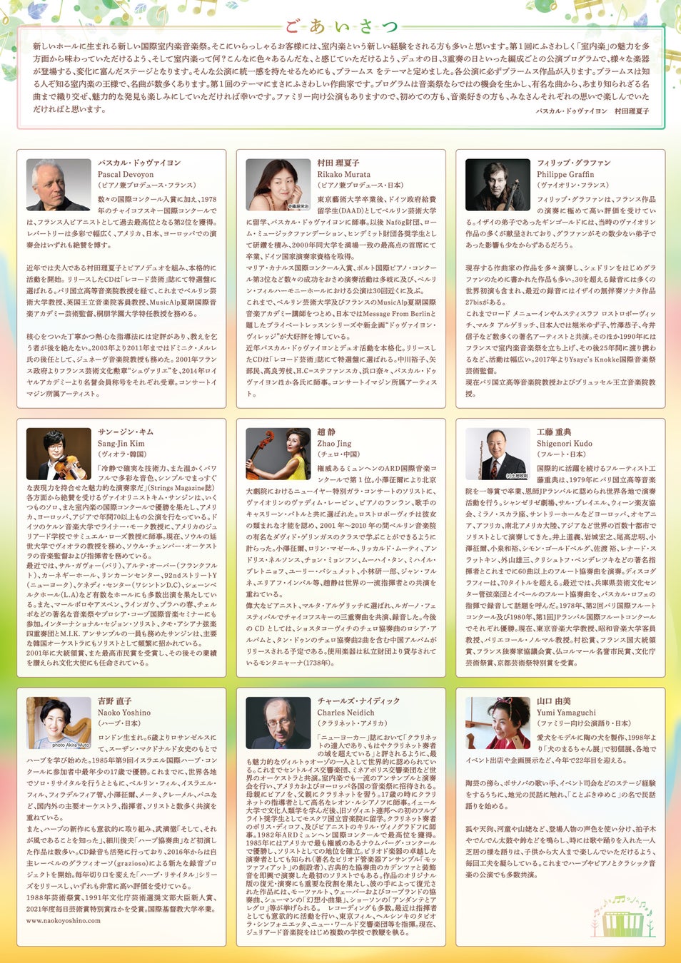 スターツおおたかの森ホール開館3周年に、流山市では、流山市在住の世界的ピアニストであるパスカル・ドゥヴァイヨン氏・村田理夏子氏をフェスティバルプロデューサーに迎え、海外及び日本国内から著名な世界的音楽家を招聘し、3日間の国際室内楽音楽祭を開催します。国内でも珍しい駅から1分以内の立地にあるホールで、GW期間中、質の高いクラシック音楽に触れる機会を提供します。流山がクラシック音楽の街になる第一歩。子どもから大人まで、初心者からコア層まで楽しめる、流山の新たな音楽イベント。