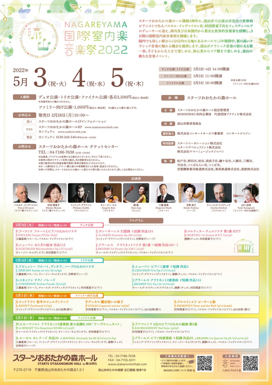スターツおおたかの森ホール指定管理者MORIHIBIKU共同企業体 代表団体アクティオ株式会社主催、『NAGAREYAMA国際室内楽音楽祭2022』が2022年5月3日(祝・火)~5月5日(祝・木)にスターツおおたかの森ホール(千葉県流山市)にて開催されます。チケットはカンフェティ(運営:ロングランプランニング株式会社、東京都新宿区、代表取締役:榑松 大剛)にて2月28日(月)より発売開始です。