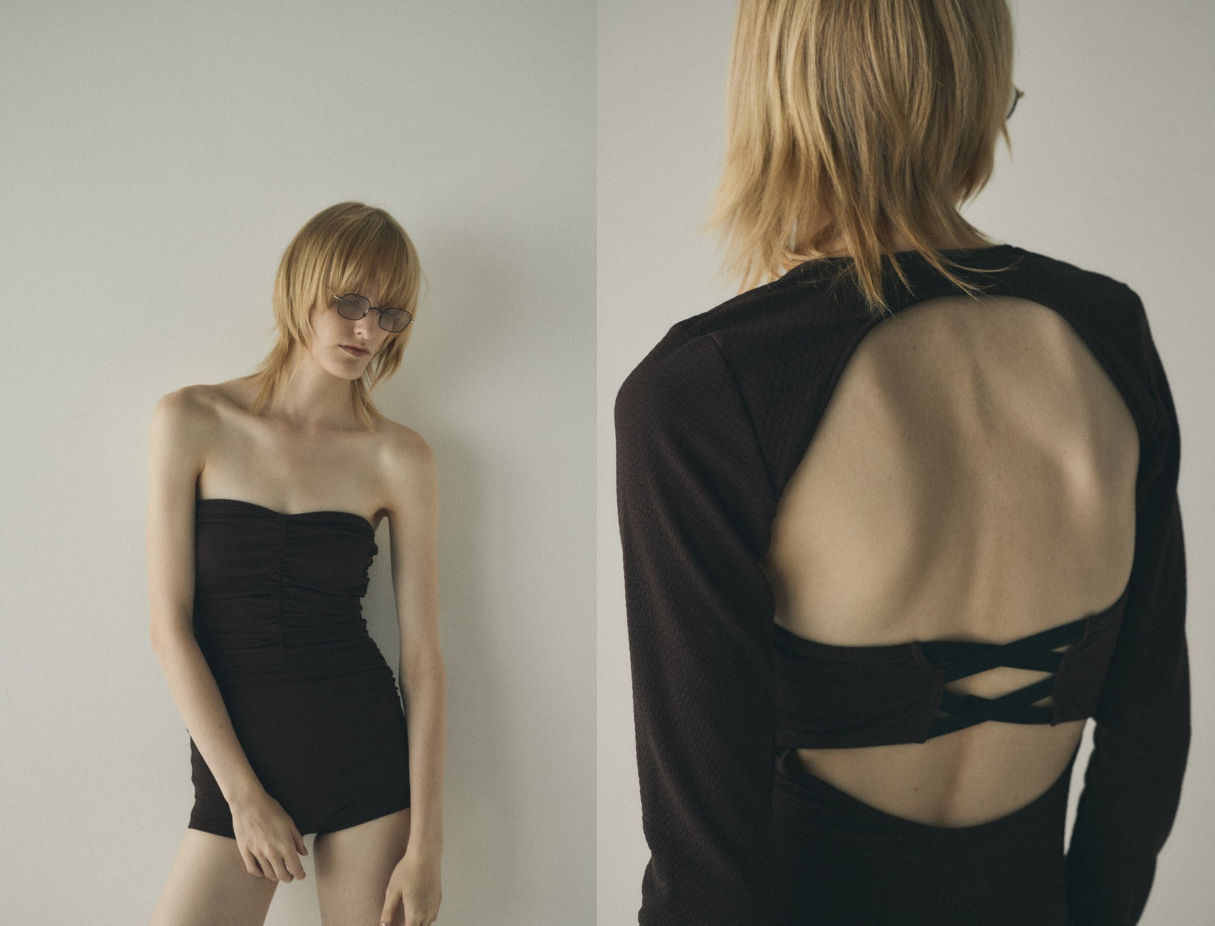 凹凸とニュアンスのある表情が魅力の生地で製作した、ベアトップ仕様のスイムウェア。