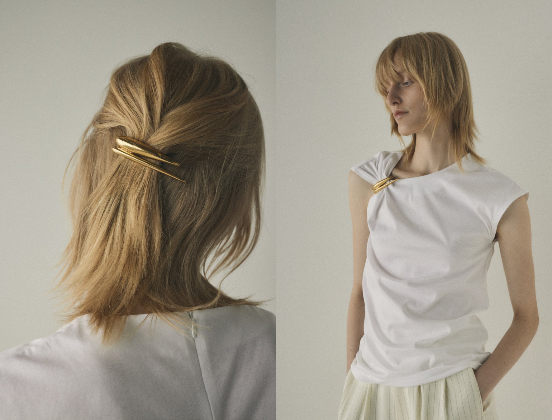 オリジナルで製作した真鍮のバレッタがSET になったトップス。バレッタ をつける事で、新しいニュアンスが生まれモダンなスタイリング に。超ハイゲージに編みたてることで、綿のカジュアル感を残しながらもハリ感と滑らかな表面感が特徴の生地のトップスは、シンプルに1枚で着用しても様になります。
