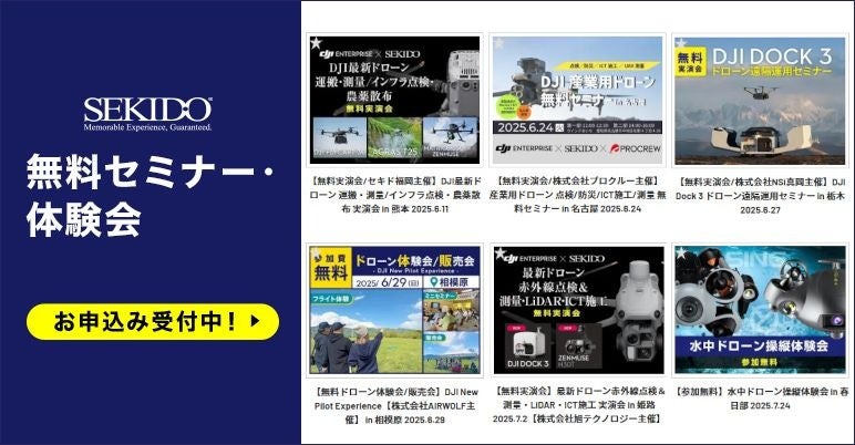 セキドでは、より多くの事業者の方にドローンを使った業務効率の改善を実現していただくため、業務用ドローンや関連ソリューションをご紹介する無料セミナーやイベントを定期的に開催しております。今後もオンラインや全国各地での開催を予定しておりますので、ご興味をお持ちのイベントにはぜひお気軽にご参加ください。