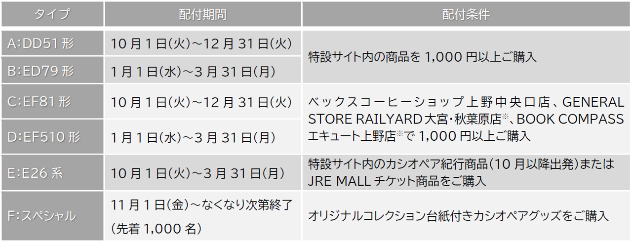 ※GENERAL STORE RAILYARD大宮・秋葉原店、BOOK COMPASSエキュート上野店では「C:EF81形」の配布は11月1日(金)より開始します。