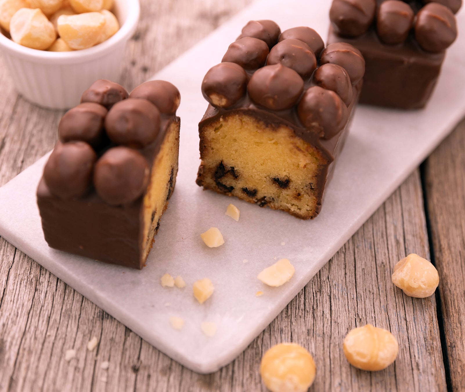 チョコチップ入りのパウンドケーキに、塩味をきかせてローストしたマカダミアナッツを贅沢にのせ、チョコでコーティングしました。