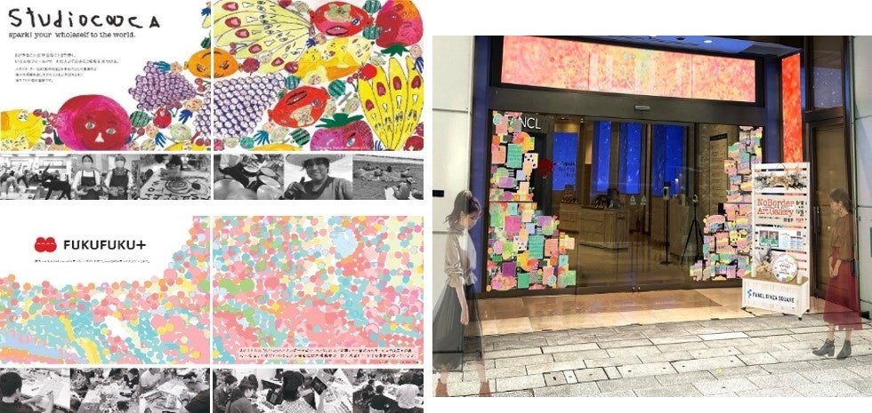 わたしたちフクフクは、障がいのあるなしに関わらず、お互いの違いを認め合い、誰もが自分の可能性を発揮できる社会を実現するため、障がいのある方のアートの力を、デザインの力で、みんなの力に変える取り組みを行っております。今回のノーボーダー・アート・ギャラリーでは、障がいのある方と学生で作った[シブヤフォント]のデータを使用し、「スタジオクーカ様」とコラボした作品やエレベータ―の扉を彩らせていただきました。