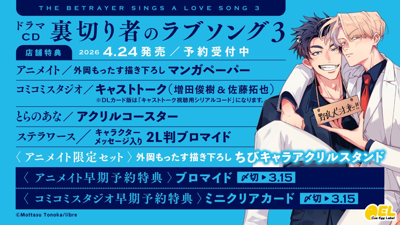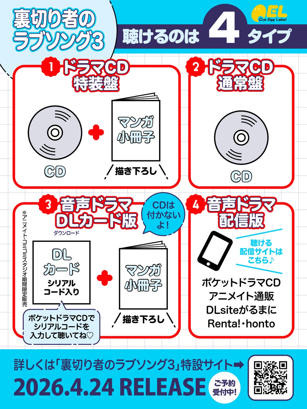 株式会社リブレ(本社:東京都新宿区、代表取締役社長:是枝由美子)は、ドラマCD「裏切り者のラブソング3」を2026年4月24日に発売いたします。https://www.b-boy.jp/special/uralove/cd/