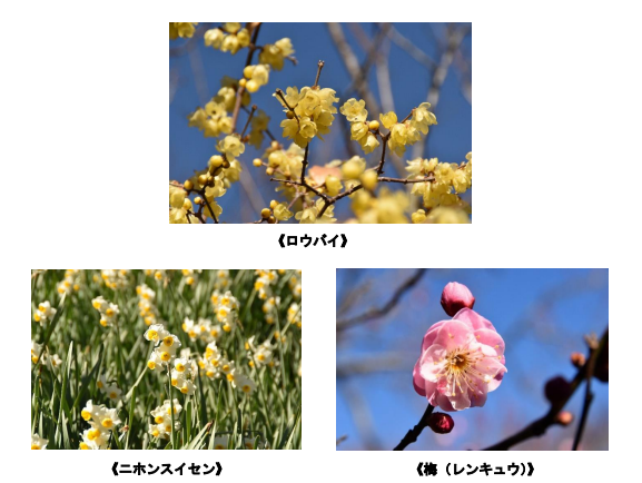 蝋細工のようなつややかな花びら(1.5~2cm)は、冬の青空の下で一層映えています。その他、濃紅色の早咲き梅も少しずつ開花を始め、上品な香りが特徴のニホンスイセンは見ごろを迎えています。なお寒い日が続きだすと地中から吸いあげた水分が凍り、氷の華となったシモバシラも朝方の時間帯を中心にご覧いただける場合があります。