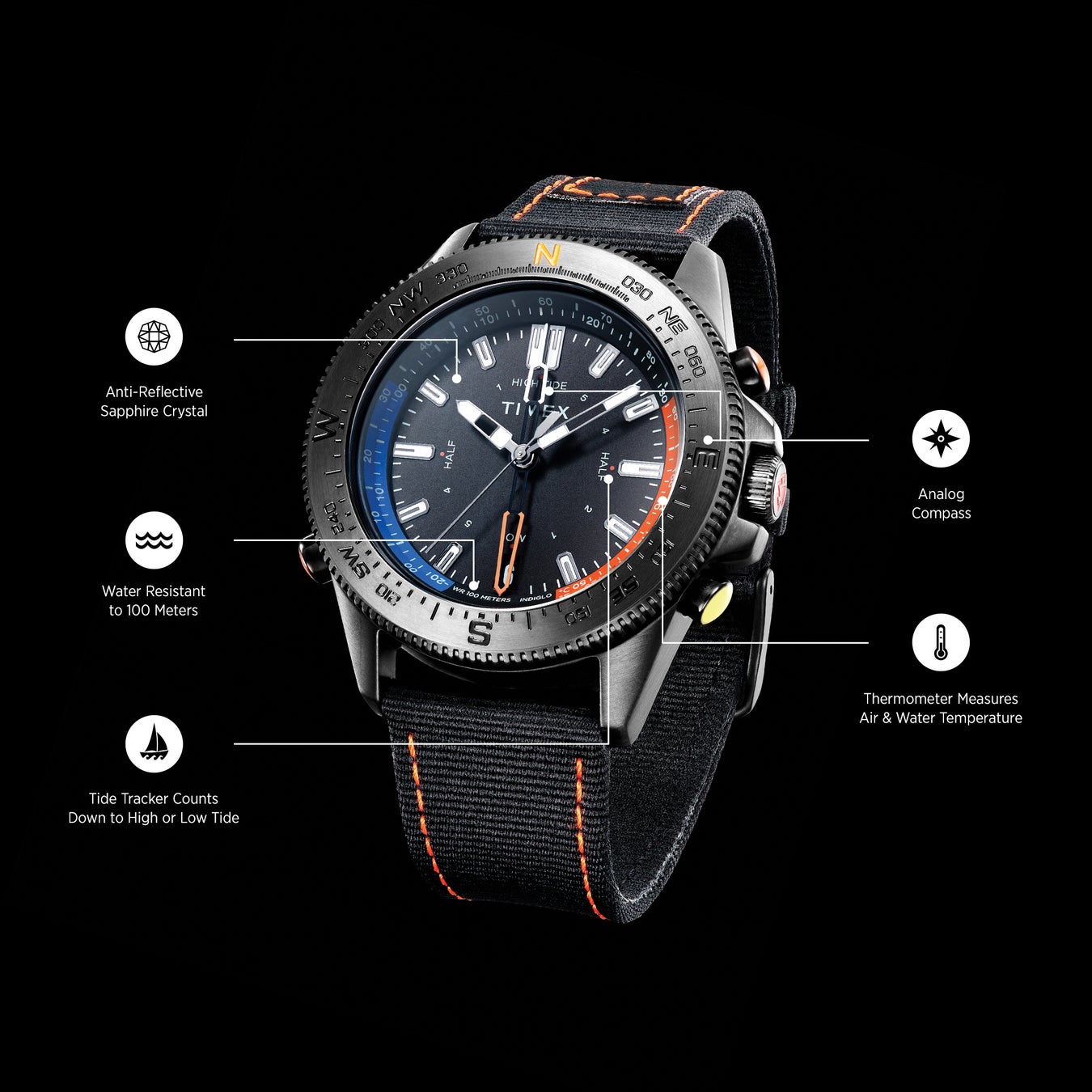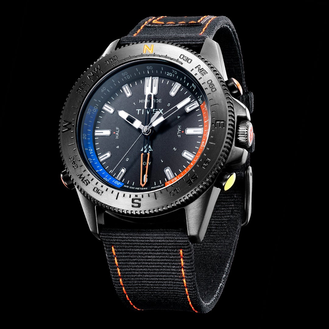 クォーツ / 43mm / 10気圧防水 / アナログコンパス / 温度計 /潮汐表 / インディグロ®ナイトライト /無販社コーティングサファイヤガラス/100%リサイクルプラスチックナイロンストラップ