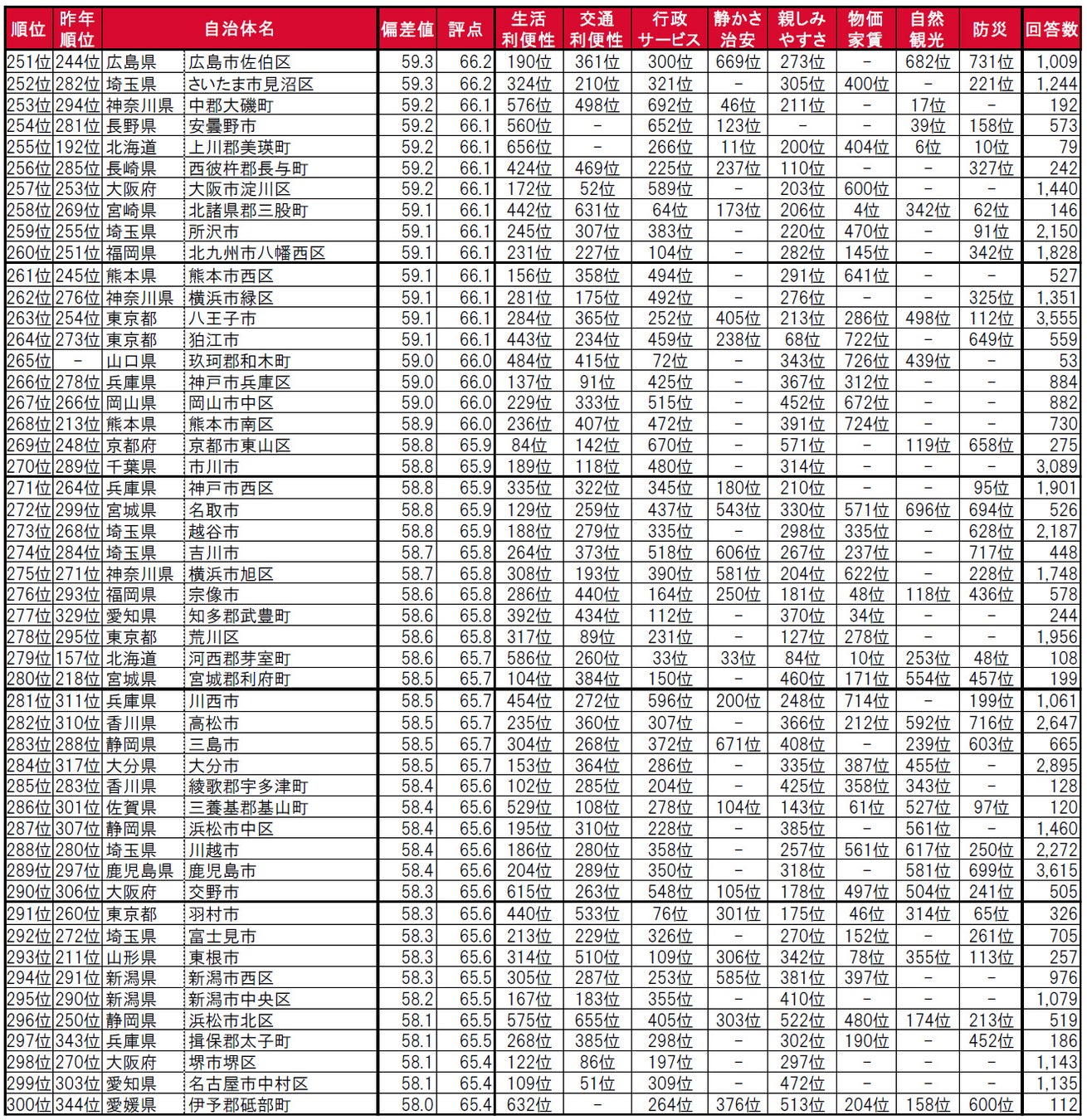 街の住みここち(自治体)ランキング<全国版>251~300位