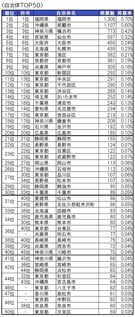 福岡県福岡市が、4年連続で1位に輝きました。2位と3位は3年連続で沖縄県那覇市と神奈川県横浜市です。4位は4年連続で宮城県仙台市、5位は大阪府大阪市が昨年6位から一つ順位を上げています。