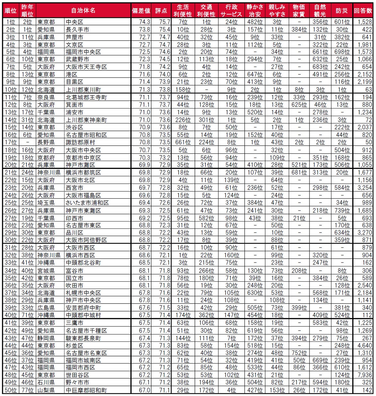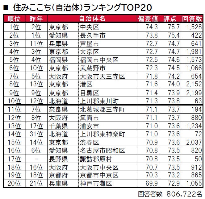 1位は、銀座や日本橋といった有名な商業中心地がある一方、月島や人形町など下町風情も残る東京都中央区です。2位は、昨年まで2年連続で1位だった愛知県長久手市で、住宅地や商業施設が多く立ち並び、自然も多い、名古屋市に隣接しているベッドタウンです。3位は、兵庫県芦屋市で、昨年11位から大幅に順位を上げてトップ3入りしています。その他、トップ10内では、8位に東京都港区(昨年13位)、10位に北海道上川郡東川町(昨年12位)が、それぞれ順位を上げてトップ10入りしています。