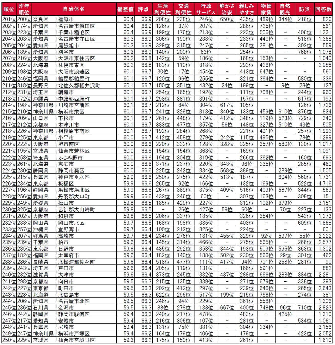 街の住みここち(自治体)ランキング<全国版>201~250位