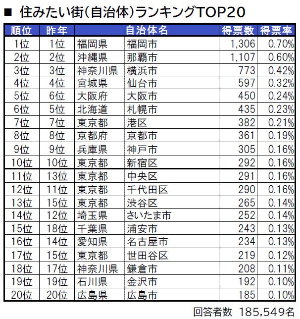 •「住みたい街(全国)ランキング」は、住みたい街(自治体)への投票を全国毎に集計してランキングを作成しています。