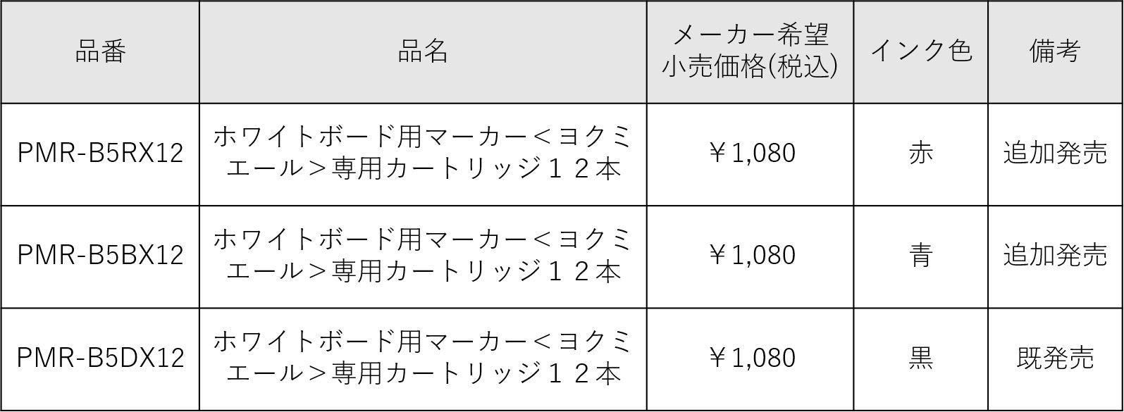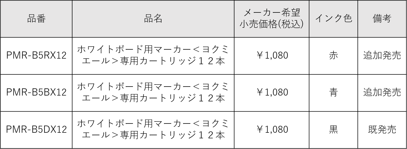 「ホワイトボード用マーカー<ヨクミエール>専用カートリッジ12本」に、既発売の黒に加え、赤、青を拡充します。