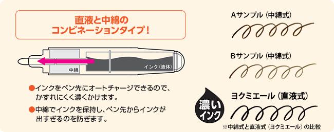 直液式と中綿式、双方の特長を生かした機構になっており、直液のインクをペン先にオートチャージすることでかすれにくさを保ちつつ、中綿でインクを保持し、ペン先からインクが出すぎるのを防ぎます。
