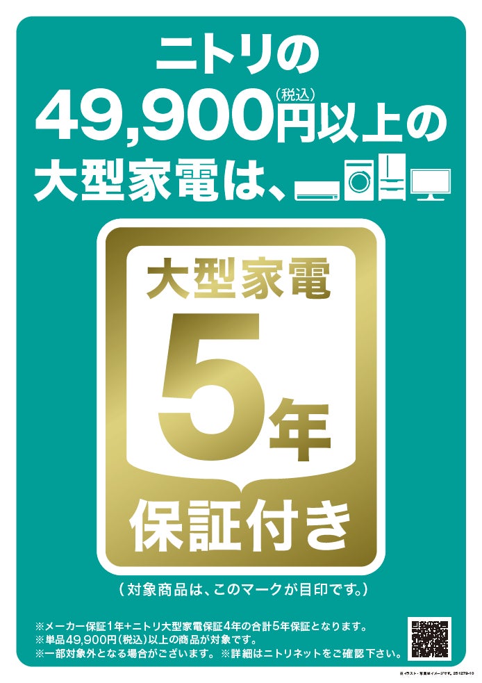 この度、もっと多くのお客様にニトリの家電を安心してご使用いただきたいという思いから、49,900円(税込)以上の大型家電を5年保証付きでの販売といたしました。