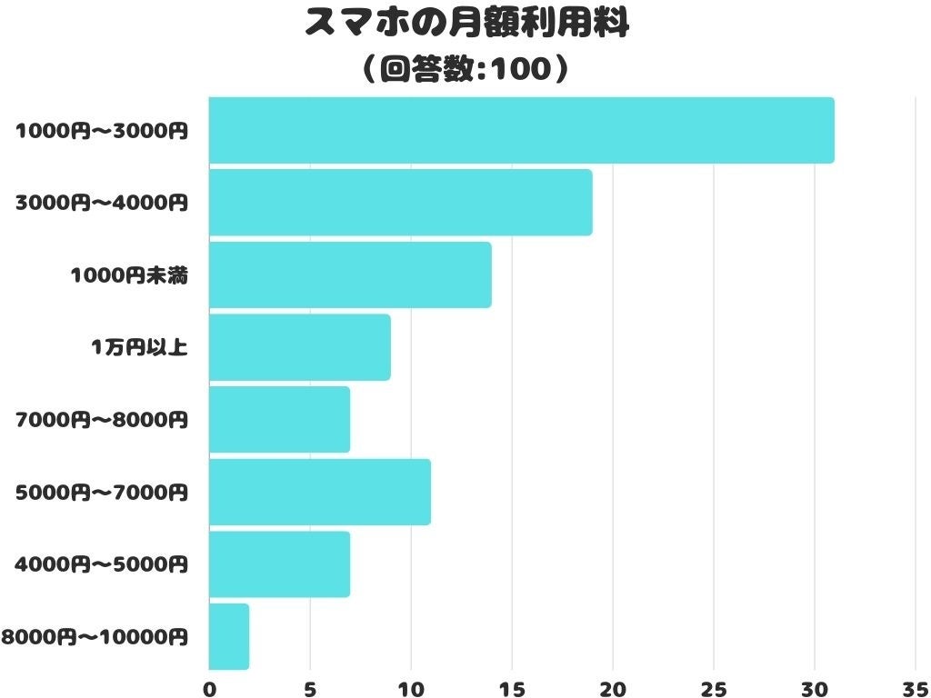 スマホの月額利用料をアンケートにて調査したところ、1位は「1000円~3000円」でした。