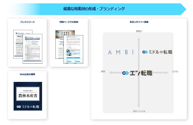 プレスリリースや特設ページ、Web広告での告知に加え、各求人サイトでの集客支援を実施。『エン転職』『AMBI』『ミドルの転職』とターゲットの異なる求人サイトを活用することで、ターゲットへ網羅的に求人を届けました。