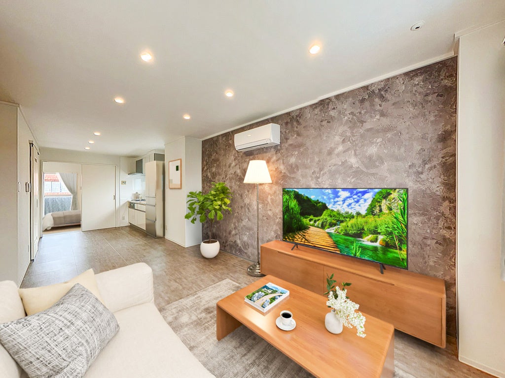 本デザインでは、コンクリート調のアクセントウォールと石目調フロアを採用しています。 無機質で都会的な素材感を取り入れることで、周辺物件との差別化を図ると同時に、住む人の感性や持ち物が映える土台をつくりました。 単なる内装変更ではなく、「自分だけの空間をつくりたい」というニーズに応えるための設計です。