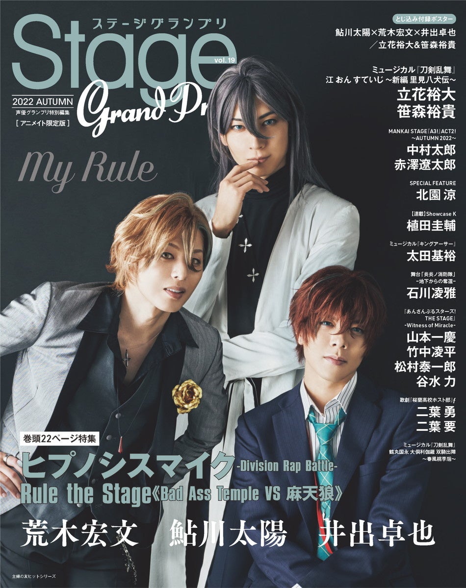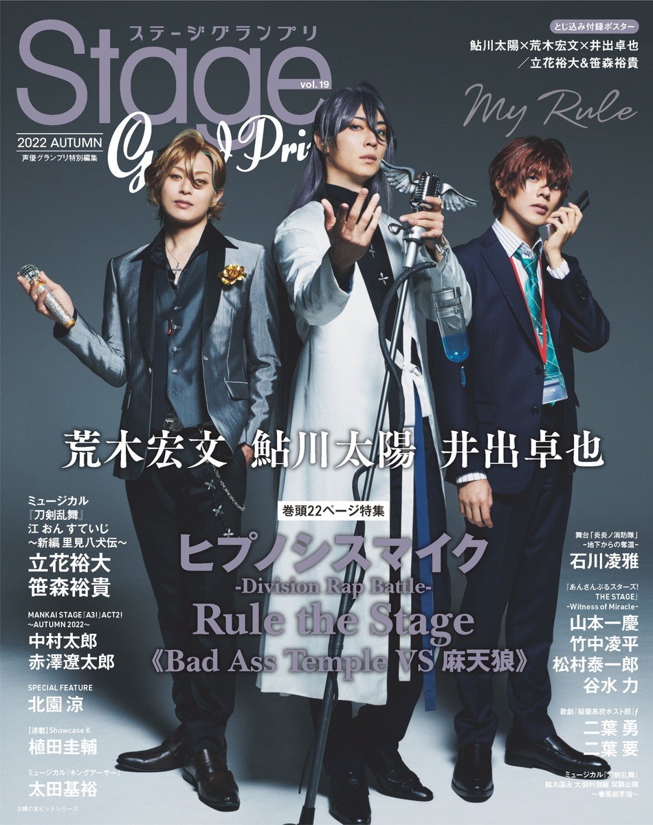 舞台を中心に様々なステージで活躍する俳優をピックアップしたグラビアマガジン『ステージグランプリ』の第19弾が10月25日に発売。表紙には『ヒプノシスマイク -Division Rap Battle-』Rule the Stage《Bad Ass Temple VS 麻天狼》 シンジュク・ディビジョン“麻天狼”より、神宮寺 寂雷役 鮎川 太陽さん、伊弉冉 一二三役 荒木 宏文さん、観音坂 独歩役 井出 卓也さんがキャラクタービジュアルで登場。裏表紙はミュージカル『刀剣乱舞』 江 おん すていじ~新編 里見八犬伝~から、豊前江役の立花裕大さん、松井江役の笹森裕貴さんが登場する。