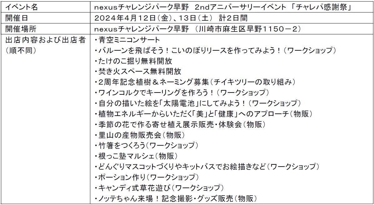 今般、2周年を記念して2024年4月12日(金)・13日(土)の2日間でアニバーサリーイベント「チャレパ感謝祭」(以下、本イベント)を実施します。本イベントでは、近隣の公立小学校や幼稚園・保育園などと連携した青空ミニコンサートや、自分の描いた絵を太陽電池にするワークショップなど実証実験を取り組んでいるバディと連携した企画を実施します。また同施設の有料会員施設である焚き火エリアを無償で一般開放するほか、同施設で取り組む6つのサステナブルテーマを企画に盛り込んで実施します。その他、地域住民主催の出店企画など、2日間にわたり地域と連携した賑わいと交流機会の創出で、住民の方と一緒に地域を盛り上げます。