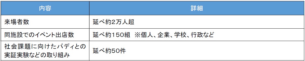 開業から2024年3月までの累計来場者数は2万人を超え、延べ150組以上のイベント出店、また、空中配送ロボット・自動運転モビリティ・ペロブスカイト太陽電池などの社会課題解決に向けた50を超えるバディとの実証実験や取り組みを実施しました。