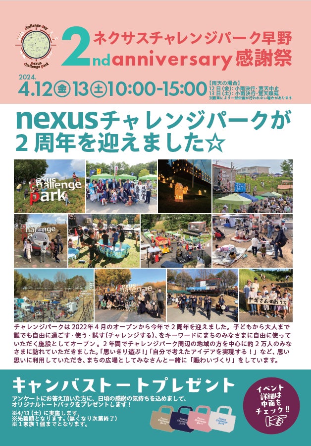 2022年より当社が推進する、多摩田園都市エリアにおける新たなまちづくりを目指す「nexus(ネクサス)構想」(以下、本構想)の第1号拠点である「nexusチャレンジパーク早野」(以下、同施設)が2024年4月7日で開業から2周年を迎えました。