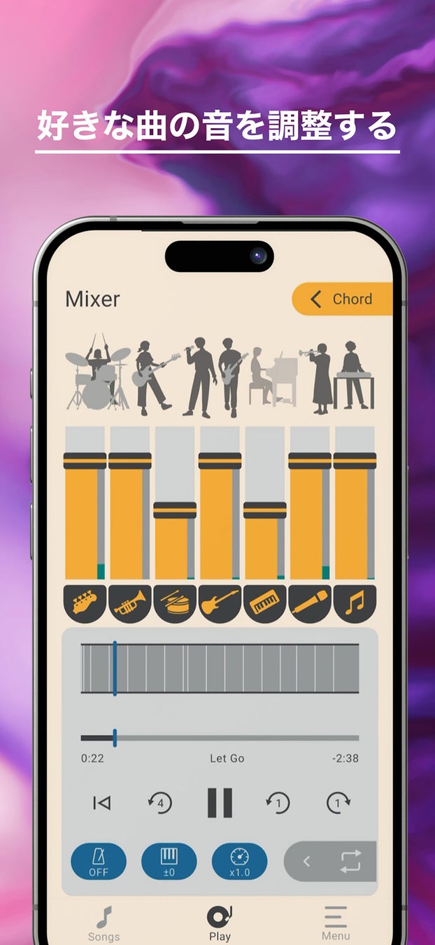 -各パートの音量を自由に調整し、「自分が演奏する楽器の音だけを聴いて耳コピをする」、「自分が演奏する楽器の音をミュートして他のパートと一緒に演奏する」、「ドラムを強調してリズムを掴みやすくする」など状況に応じた柔軟な練習が可能