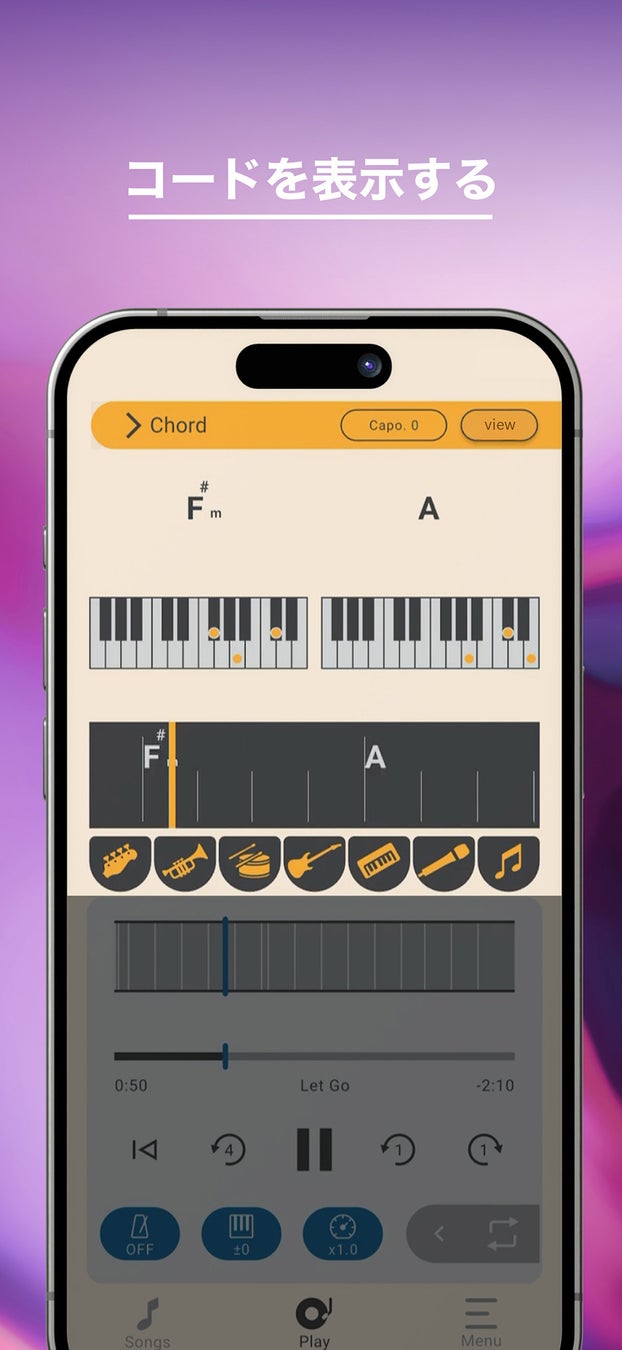 -ギターや鍵盤の押さえ方も表示され、初心者でも視覚的に演奏しやすい