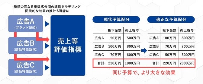 ブランド認知のための広告は、直接的な売上には結び付きにくいものの、商品特性を訴求する広告の効果を裏で支える効果を持つ側面があるなど、広告間には階層的な構造が存在します。また、広告効果と予算は単純な比例関係にはなく、出稿金額が増えるにつれ効率は低下していく傾向があります。本協業は、種類の異なる複数の広告を併用する広告主様に対して、パス解析を用いてモデル化(※3)することで、間接的な広告効果の推計を行い、更に各広告効率の低下度合いを踏まえた上で、適正な予算配分の提案をいたします。